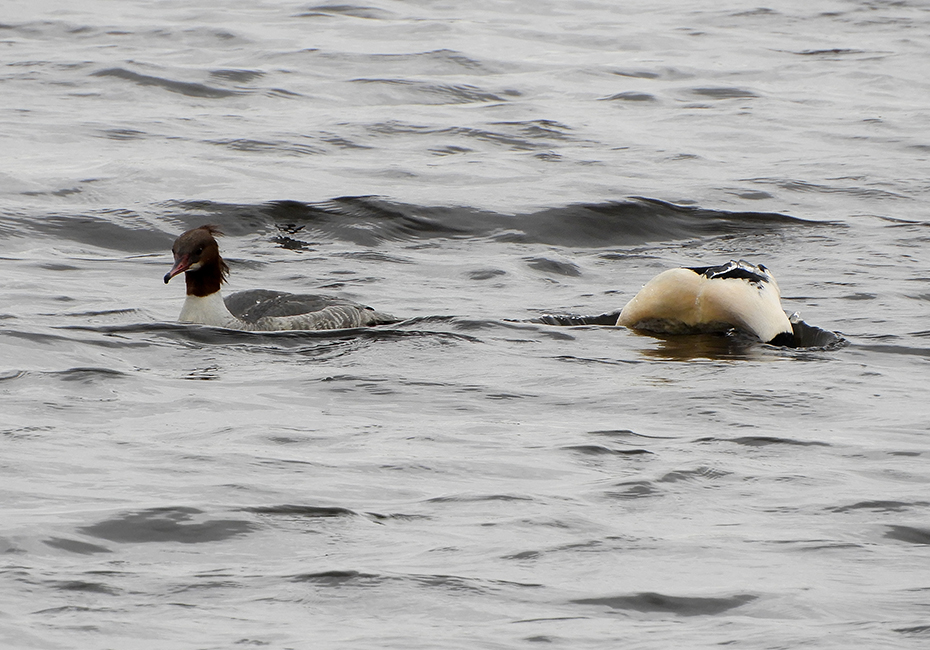 We tuurden en tuurden, maar er was geen ijsvogel te zien. Wel zwom er een paartje grote zaagbek. Deze eend behoort, de naam zegt het al, tot de  zaagbekken. Terwijl ik deze foto nam dook het mannetje onder water.