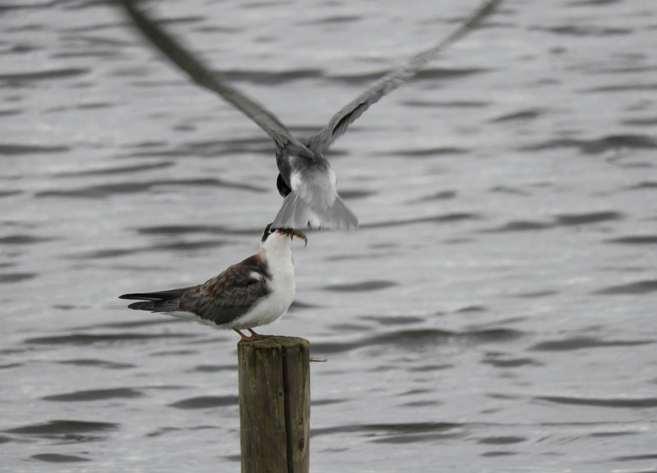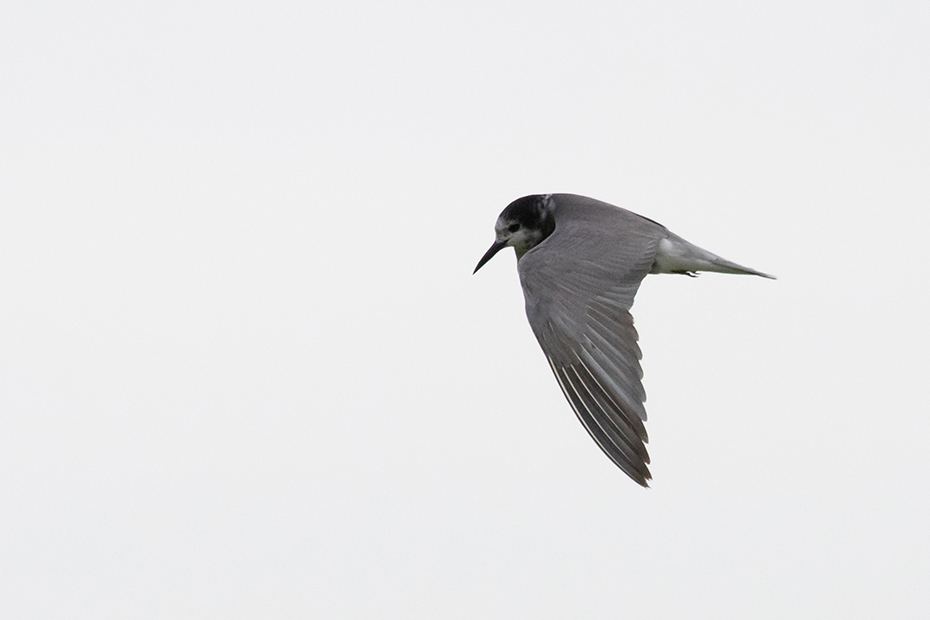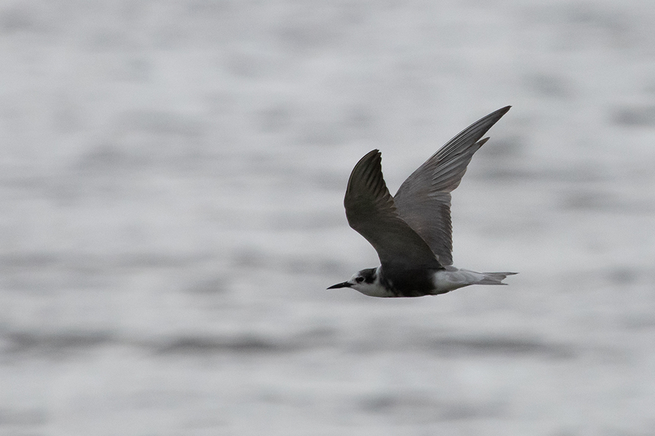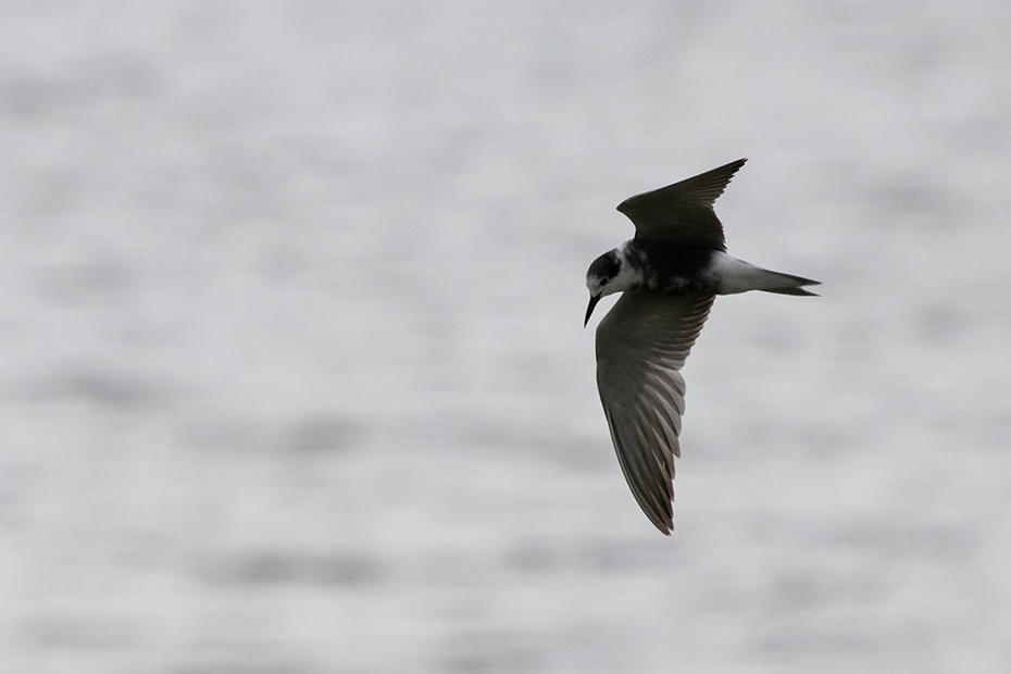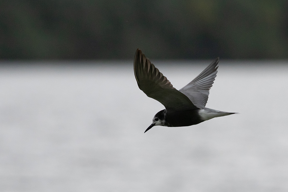 Enfin, we waren niet voor de meeuwen gekomen, maar voor de zwarte sterns. Na lang wachten kwam er dan toch van tijd tot tijd een zwarte stern voorlangs vliegen. Ik richtte mijn spiegelreflex en 100-400 objectief op de zwarte stern, maar helaas de autofocus kon de snelle vogels niet scherpstellen. Wellicht was het te donker en vielen de vogels weg tegen het donkere water. Vervolgens heb ik de camera met de hand scherpgesteld en toen lukte het beter.