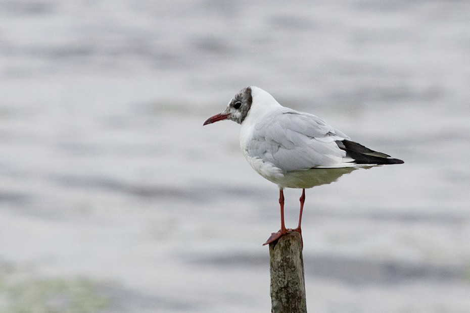 Voor de hut staan meerdere palen in het water. Op een van de palen stond een meeuw. Toen ik een aantal dagen later met deze foto’s bezig was verdiepte ik mij in deze meeuw. Ik gebruikte daarbij de ANWB vogelgids van Europa. Ik vind dat een waardevolle aanvulling op de informatie wat op internet is te vinden. In dat boek las ik dat het een kokmeeuw was. Deze meeuw had echter geen chocoladebruine kop. Meeuwen kennen qua uiterlijk meerdere leeftijdsgroepen. Ieder jaar dat ze ouder worden zien ze er anders uit. Dat verklaart dus ook dat deze meeuw geen chocoladekleurige kopkap heeft, maar dat er nog veel wit in de kopkap zit. Onderstaande meeuw is een adult (volwassen) van de 1e zomer. Dat het een adult is en geen juveniel zie je aan de kleur van de poten en de snavel.
