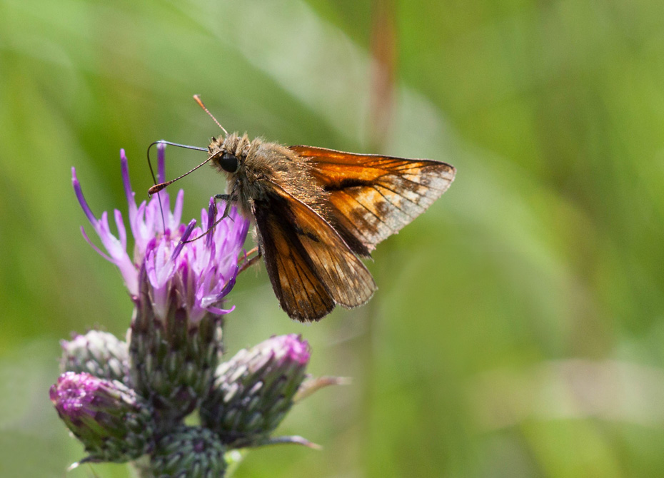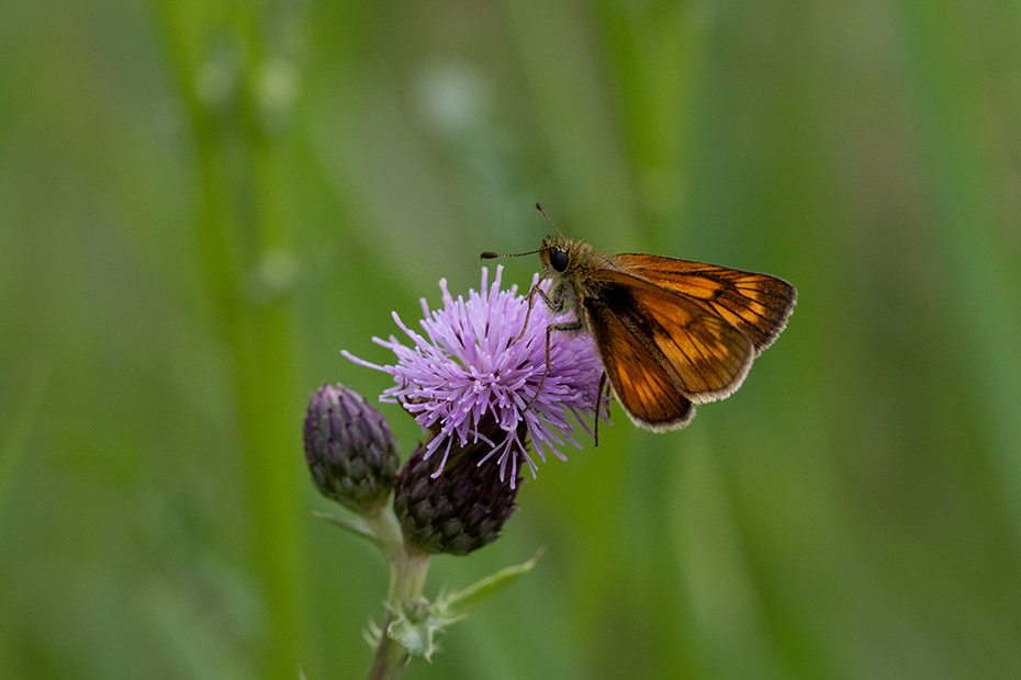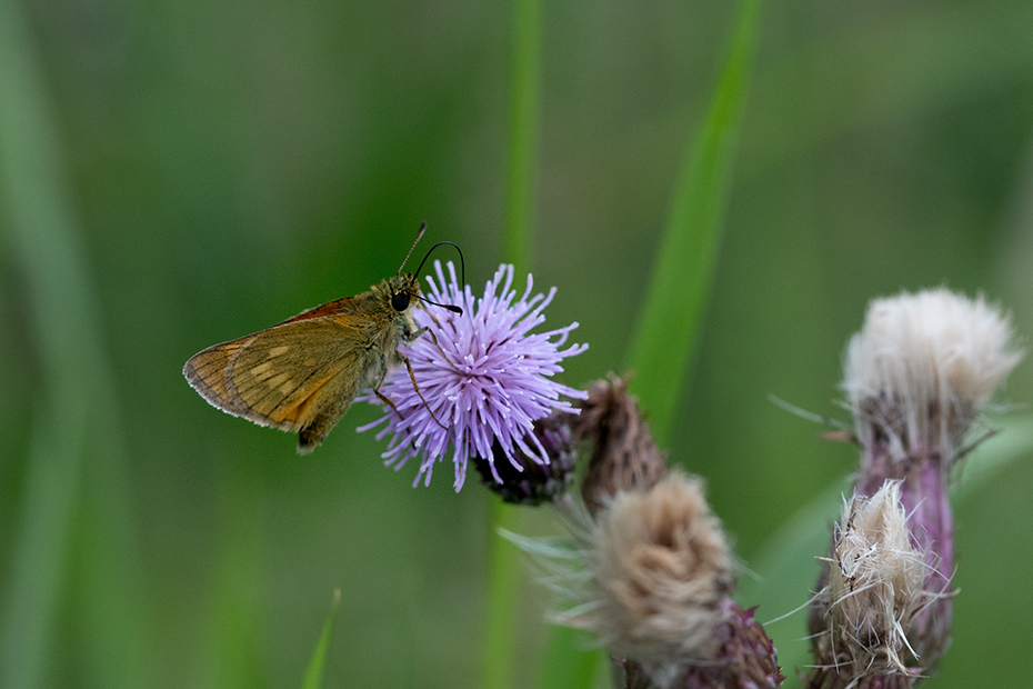 In de sloot stonden veel kattenstaarten. En tot onze verrassing wemelde het op die kattenstaarten van de vlinders. De kleine vos, dikkopjes, bruine zandoogjes en andere insecten deden zich tegoed aan hetgeen de kattenstaarten te bieden hadden. De kleine vos vind ik een van de mooiste algemeen voorkomende vlinders.