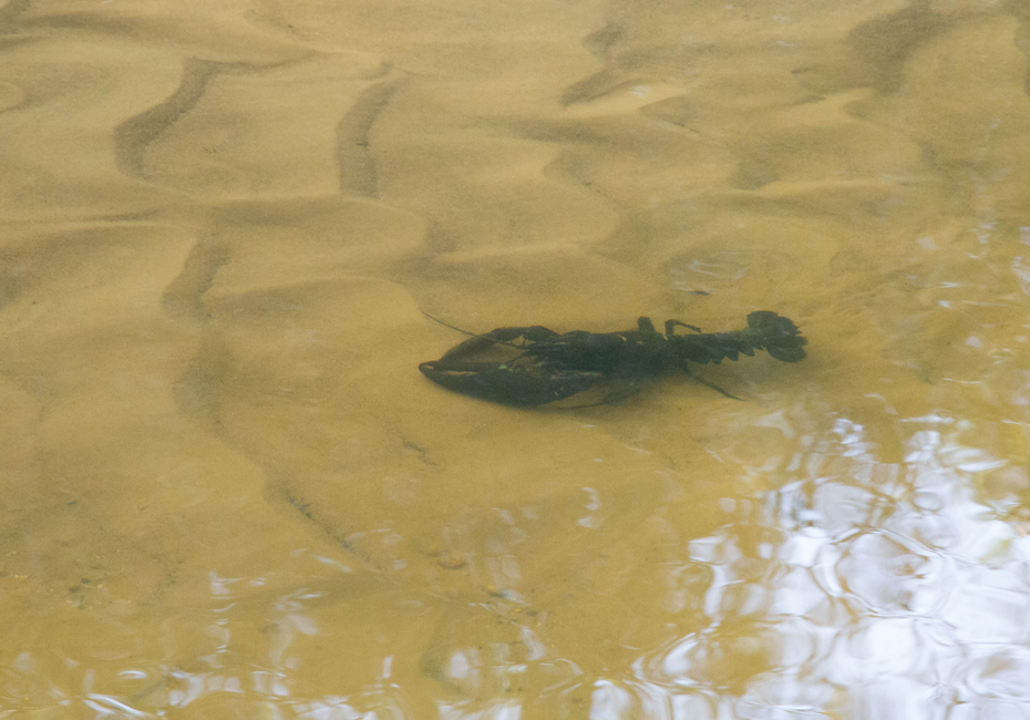 Terwijl ik op weg was naar de vogelkijkhut waren twee mannen bezig om vanaf een trailer een boot te water te laten. Op dat moment dacht ik nog dat het vissers waren. Toen ik even later op de oever van de Linde stond en inzoomde op de waternavel en op het bootje heb ik het idee dat ze toch met een ander doel waren gekomen. Misschien dat het onderzoekers waren.