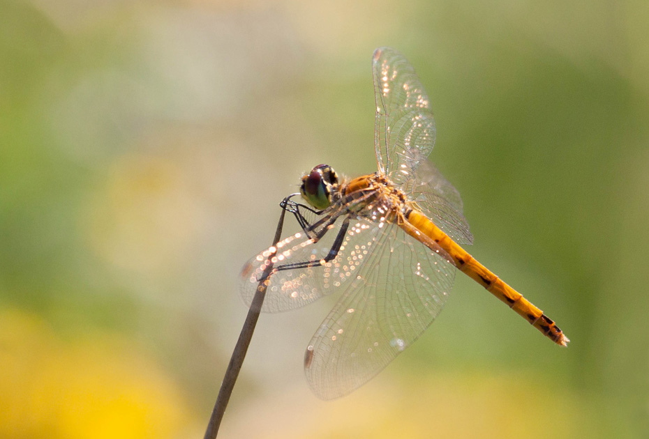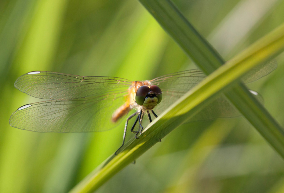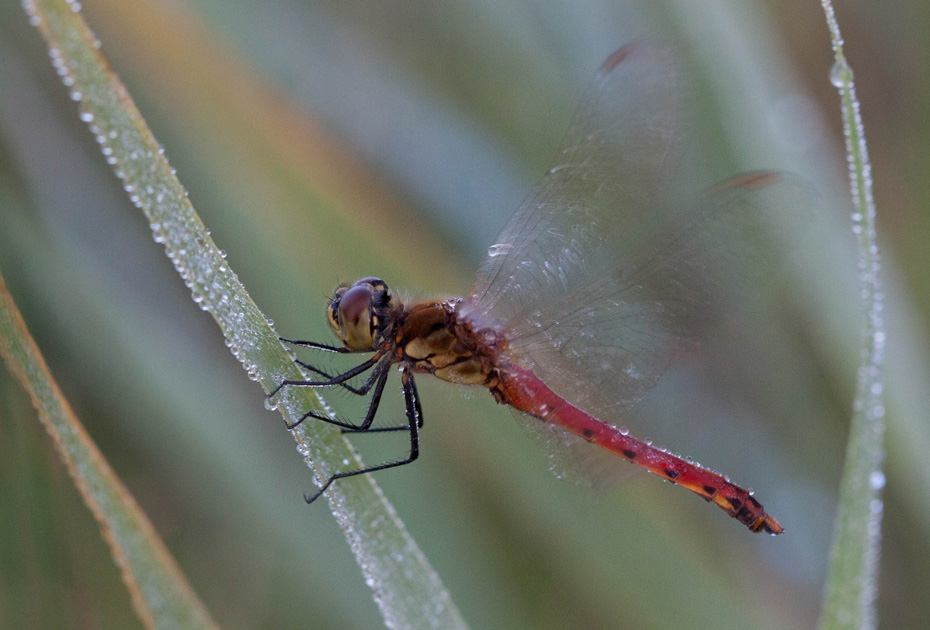 Uiteindelijk is het toch nog gelukt om een grassprietje te vinden met daarop een heidelibel. Volgens Obsidentify is het de bloedrode, maar het kan net zo goed de steenrode heidelibel zijn. Voor een goede observatie moet je ze meer van voren vastleggen.