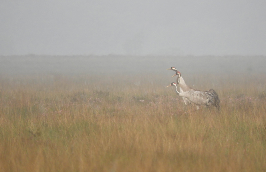 Tot het moment dat de stilte werd doorbroken door de roep van kraanvogels. Eerst zaten ze ver weg. Even later hoorde ik ze veel dichterbij. Ik zoomde in met mijn camera en ja hoor daar zag ik ze…