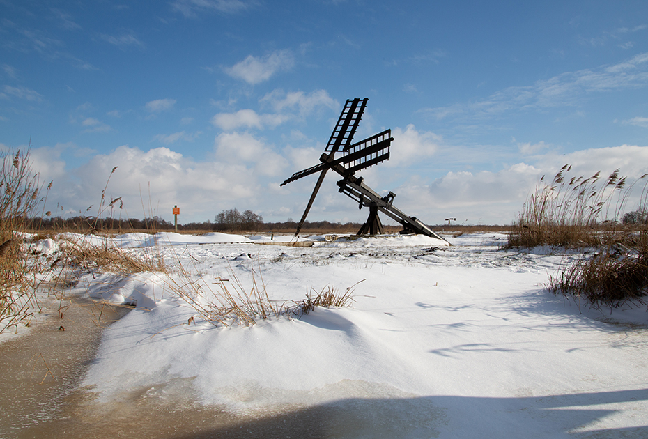 En dan nu het verhaal van de ‘Verloren schaatsen’ zoals de titel aangeeft. Er kwamen drie mannen aan schaatsen. Een van de mannen kwam te vallen. De buiteling heb ik niet kunnen fotograferen, maar wel het moment dat de man beduusd op het ijs zat. Wat was er nu gebeurd? Hij was zijn beide schaatsen verloren en die lagen naast elkaar pakweg zes meter terug. De schaatsen waren finaal onder de schoenen vandaan geknapt. Bijzonder is dat het met beide schaatsen tegelijk gebeurde. Dan mag je ook wel beduusd kijken. Er zat voor deze mannen niets anders op dan weer terug te gaan naar de auto. Een geluk bij een ongeluk was dat ze nog maar net aan hun tocht waren begonnen en dat de auto dichtbij stond. Een typisch voorbeeld van materiaalmoeheid…