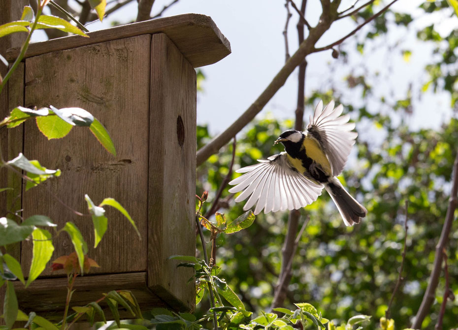 Toen ik de serie van de roodborst liet zien kreeg ik reacties waarbij men het jammer vond dat ik het vogeltje had “opgesloten” in een kooitje. Speciaal voor dit bericht over de koolmees heb ik vandaag een fotoserie gemaakt waarbij ik het kooitje tijdelijk heb weggehaald. Tussen een paar buitjes door scheen de zon. Het is te zacht voor de tijd van het jaar, de muggen dansten vandaag in de tuin. Op onderstaand foto kun je nog net drie muggen onderscheiden.