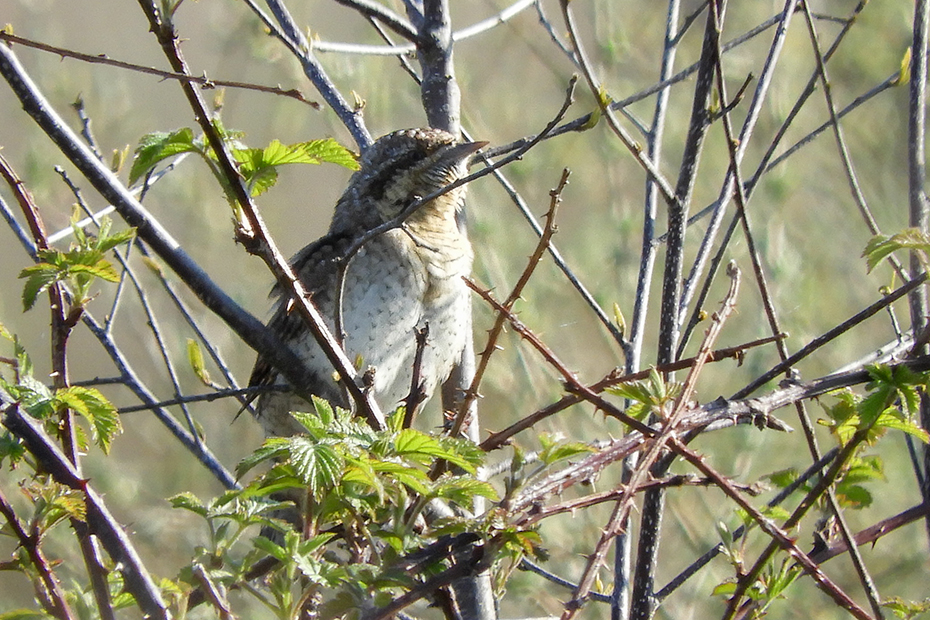 Even later vloog de draaihals in een struik dichterbij het pad. De draaihals zat toen wel veel dichterbij, maar bleef goed verstopt tussen de takken. Meer dan onderstaande beeld kon ik er niet uitslepen.