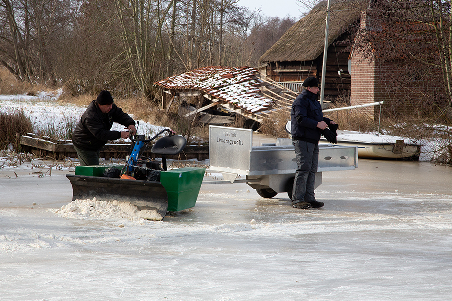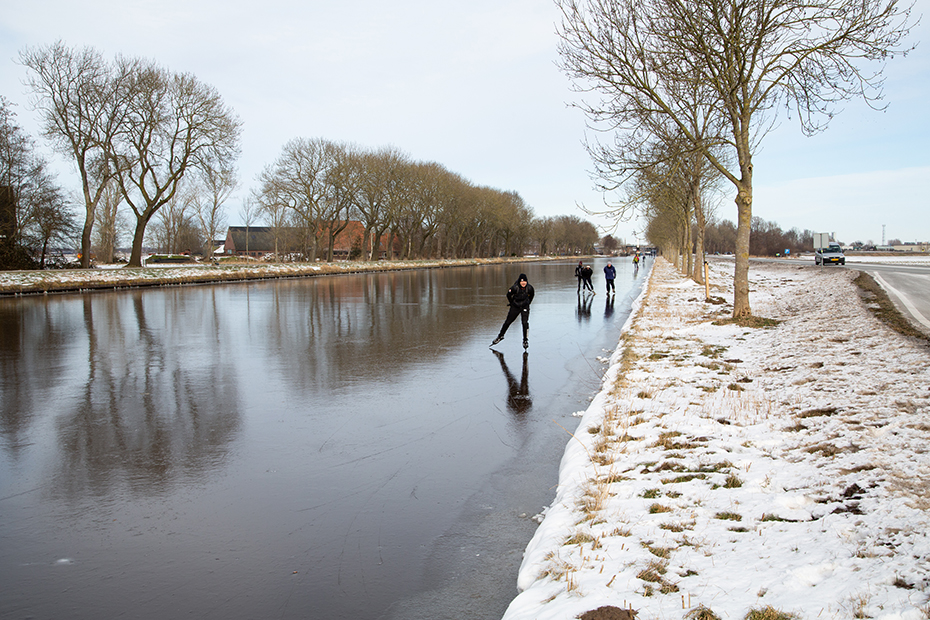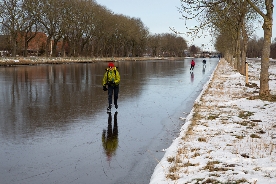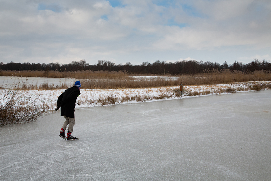 Tijdens de koffie herinnerde Jan mij eraan dat ik hem nog een keer zou meenemen naar het monument ’De Schaatser’. Dat leek me een goed plan op die bewuste winterdag. Tijdens de koffie konden we nog niet bevroeden dat we, op weg naar ‘De Schaatser’, ook echte schaatsers in De Weerribben zouden vastleggen. Het schaatsen op natuurijs was niet verantwoord, toch lieten velen zich er niet van weerhouden om de ijzers onder te binden.