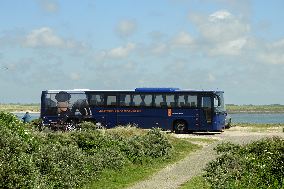 Op de laatste dag van de vakantie op Texel maakten we een wandeling in De Hors. Nadat wij de auto hadden geparkeerd en net waren begonnen aan onze wandeling reed er een bus langs van de Koninklijke Marine. Aan het einde van die weg is de militaire basis Joost Dourlein gevestigd.