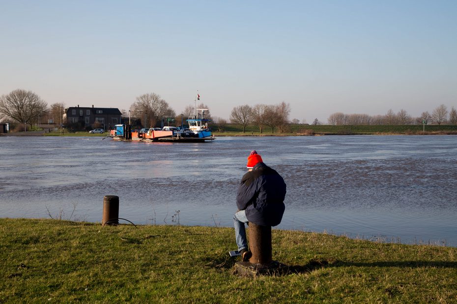 Het pontje kwam net vanaf de overkant naar ons toe. Terwijl we stonden te wachten kwam er een echtpaar op de fiets en die lieten we mooi voor gaan. Zo konden wij de kunst afkijken en meteen enkele foto’s nemen.