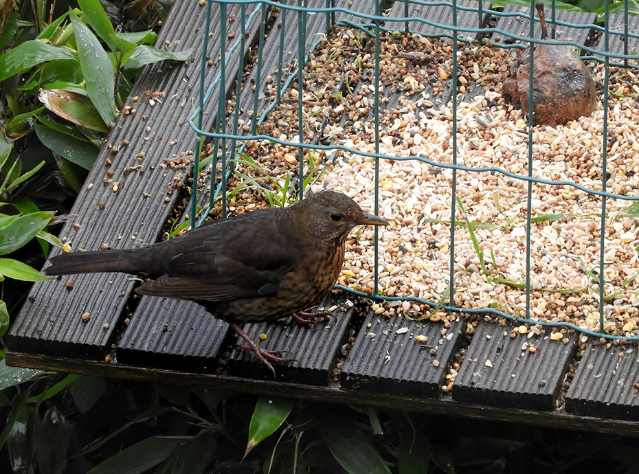 Die momentopname wordt in onze tuin beïnvloed door de aanwezigheid van de merel. Als de merel in de buurt is dan blijven de andere vogels noodgedwongen uit de buurt. De merel, in dit geval een vrouwtje, duldt geen andere vogels binnen een cirkel van vier meter.